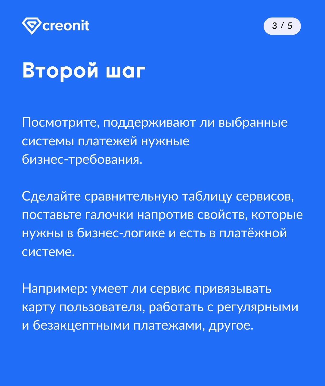 Например: умеет ли сервис привязывать карту пользователя, работать с регулярными и безакцептными платежами, другое.