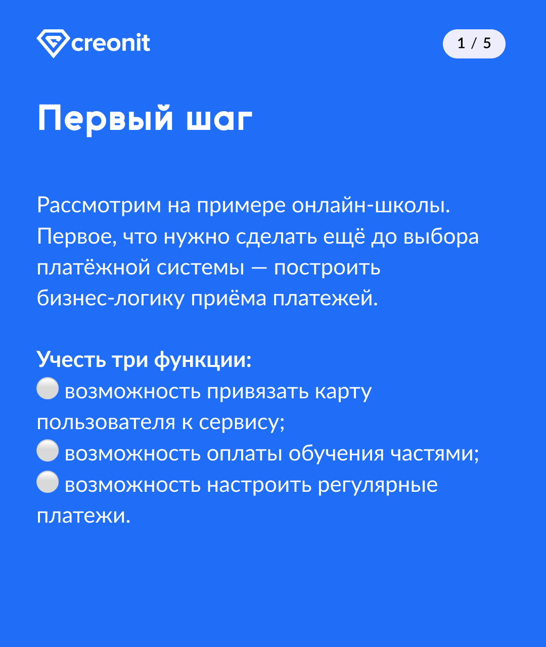 Рассмотрим на примере онлайн-школы. Первое, что нужно сделать ещё до выбора платёжной системы — построить бизнес-логику приёма платежей.