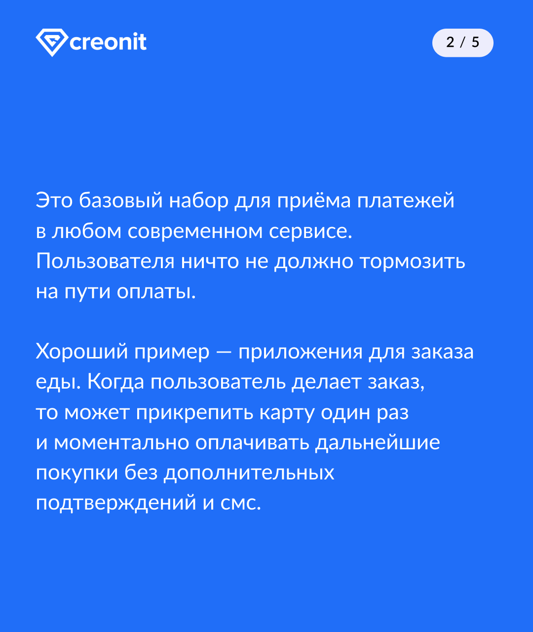 Хороший пример — приложения для заказа еды. Когда пользователь делает заказ, то может прикрепить карту один раз и моментально оплачивать дальнейшие покупки без дополнительных подтверждений и смс.