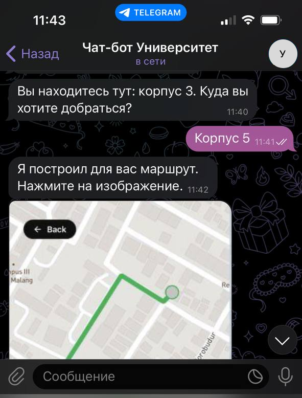 Чат-бот сможет отвечать на любые вопросы, которые соберёт университет. Например, о расписании, в каком кабинете пара, как пройти в аудиторию. При этом он будет не просто высылать текстовый формат с адресом. Для каждого места можно прикрепить иллюстрацию с картой и нарисованным маршрутом.