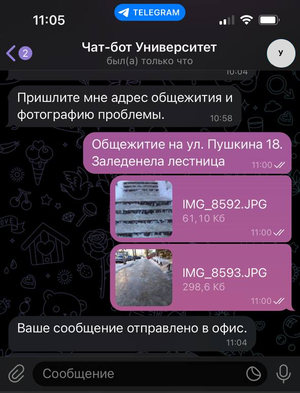 Например, в общежитии отключили воду. Ключевое слово: общежитие. Действия бота: 1. Попросить студента указать адрес общежития. 2. Перенаправлять сообщение в управление учебных корпусов и общежитий.