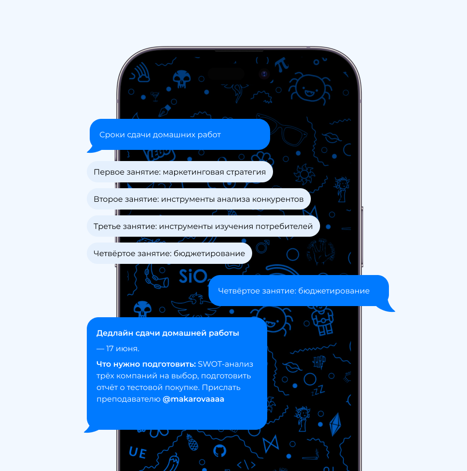 Бот напоминает пользователю о необходимых действиях: повторить изученный материал, сдать задание, подключиться к семинару и так далее. Причём делает это до тех пор, пока учащийся не выполнит задание. Эта функция особенно полезна, учитывая, что студентам могут быть назначены личные дедлайны и время прохождения тестов, которые не совпадают со временем прохождения теста основной группой учащихся.