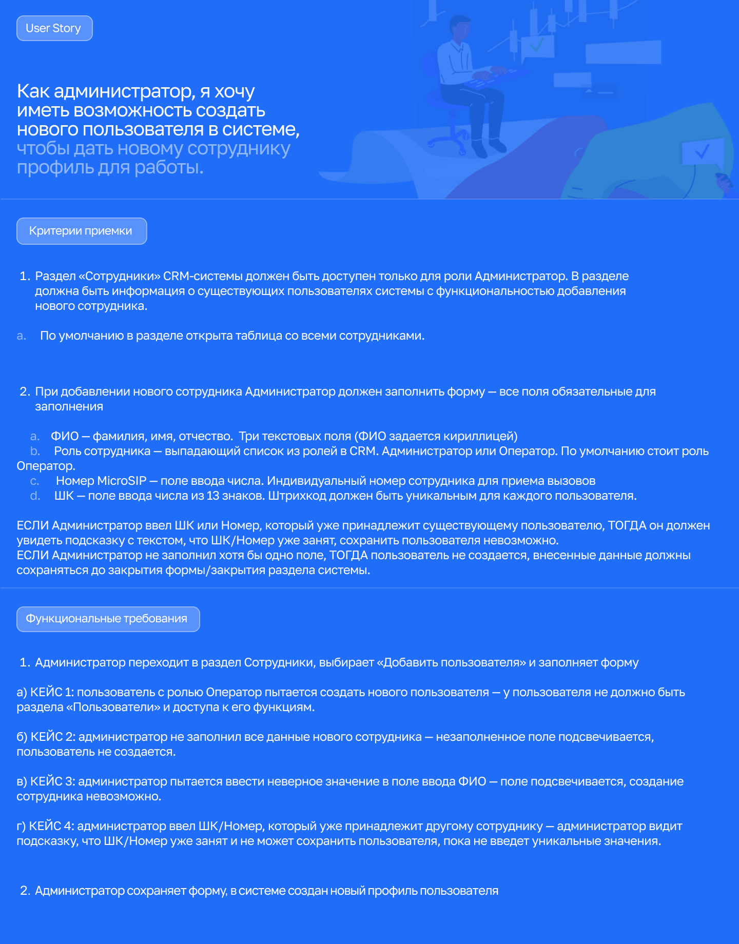 С помощью этого документа заказчику проще изучать полученный продукт — не придётся скроллить все экраны приложения вручную или вчитываться в техническое задание. Можно удостовериться, что пользователь сможет выполнить целевое действие в сервисе на основе прописанных User Stories и критериев приёмки.