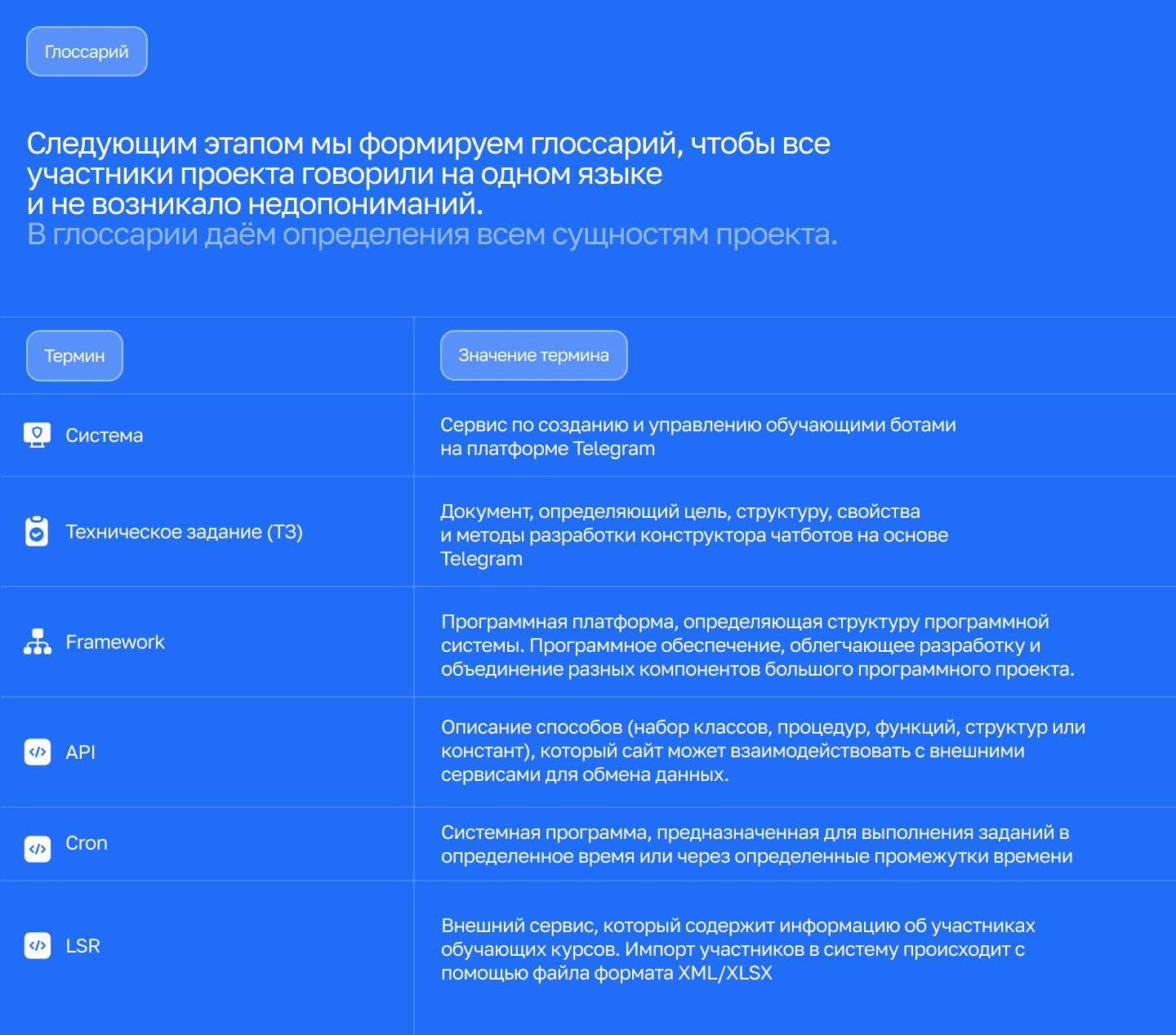 Следующим этапом мы формируем глоссарий, чтобы все участники проекта говорили на одном языке и не возникало недопониманий. В глоссарии даём определения всем сущностям проекта.