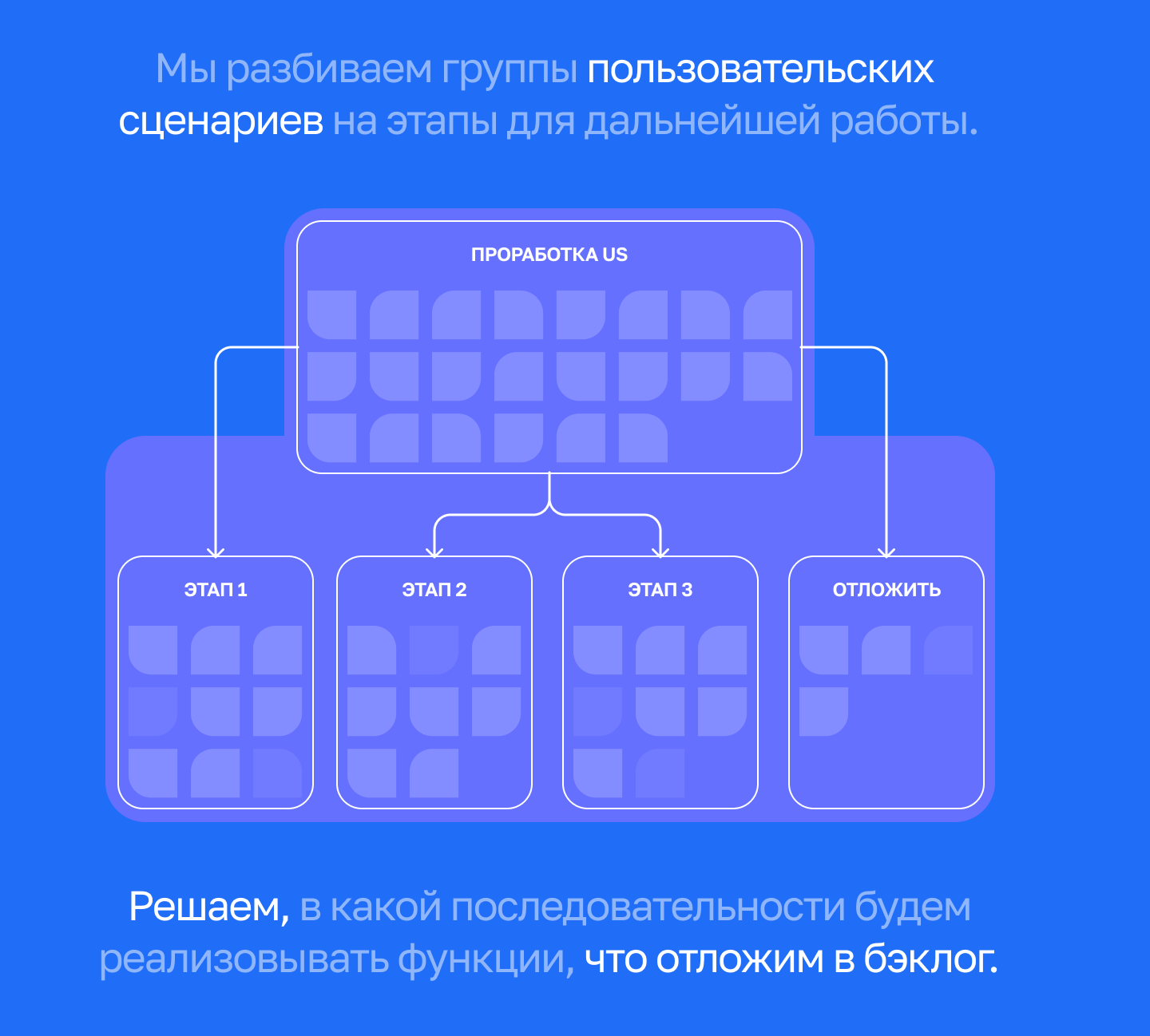 Мы разбиваем группы пользовательских сценариев на этапы дальнейшей работы. Решаем, в какой последовательности будем реализовывать функции, что отложим в бэклог.