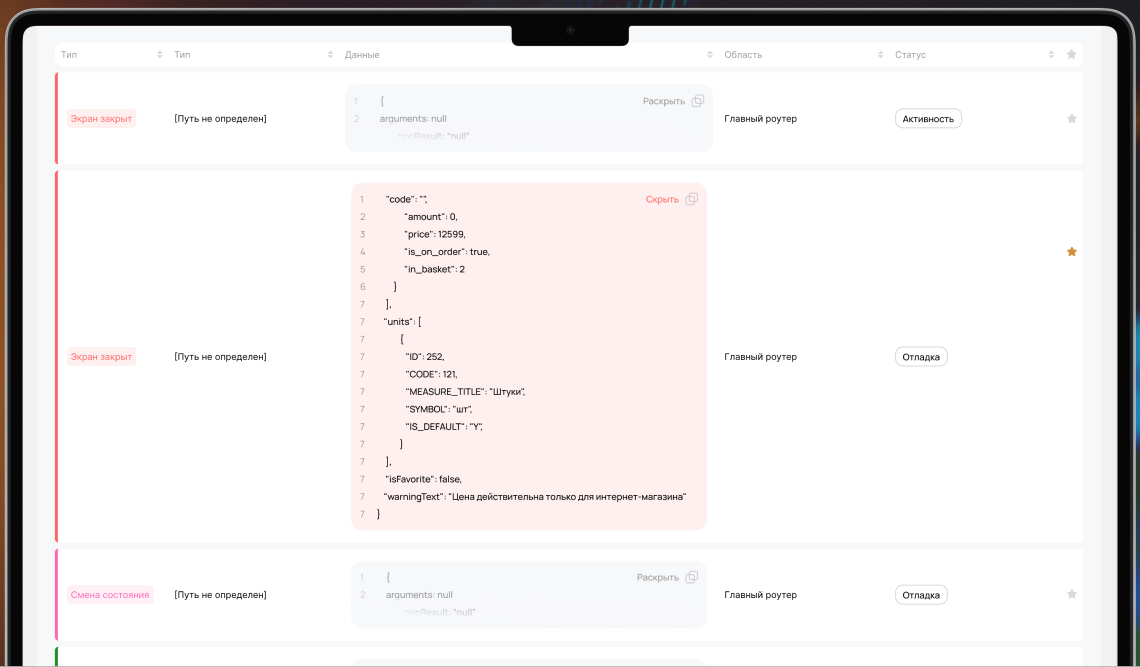 LogScope не только находит ошибки и исключения в работе приложения, но и показывает причины их появления. Позволяет отследить контекст взаимодействия пользователя с продуктом: какие экраны он открывал, какие кнопки нажимал, переподключал ли Wi-Fi и так далее.