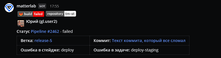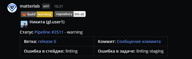 Цвета уведомлений подсказывают статус сборки. Внутри есть ссылки, чтобы сразу перейти в GitLab и посмотреть, что пошло не так.