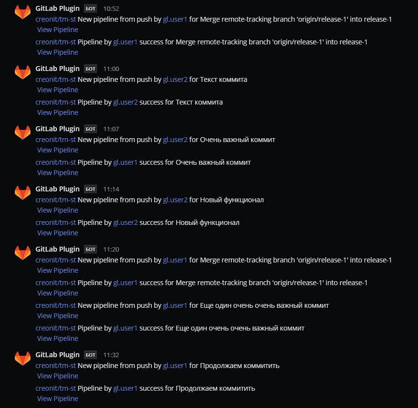 Теперь каждый раз, когда срабатывает CI/CD (сборка проекта на сервере), в канал Mattermost, откуда вызвали приложение, приходят уведомления о статусе завершения сборки.