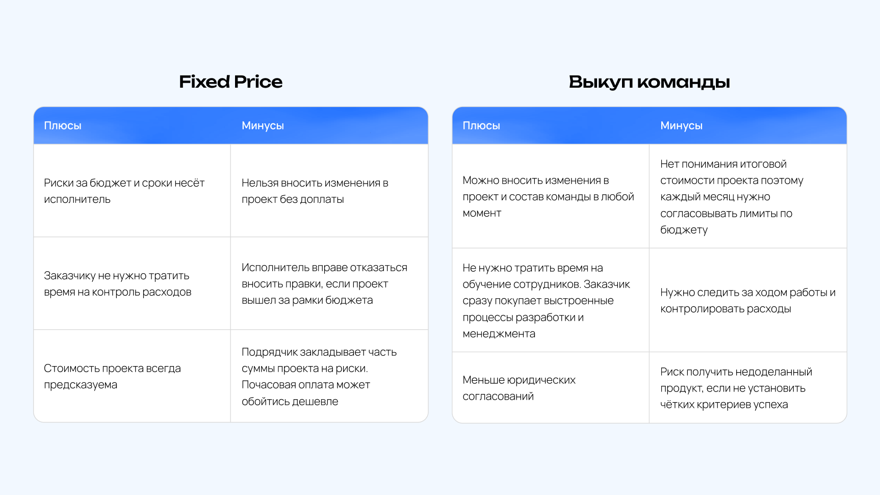 Fixed Price подходит для небольших проектов с понятным набором задач, выкуп команды — для сложных сервисов в активной фазе развития или проектов с высокой степенью неопределённости. Рассказываем о плюсах и минусах каждого формата и как их можно совмещать на больших проектах.