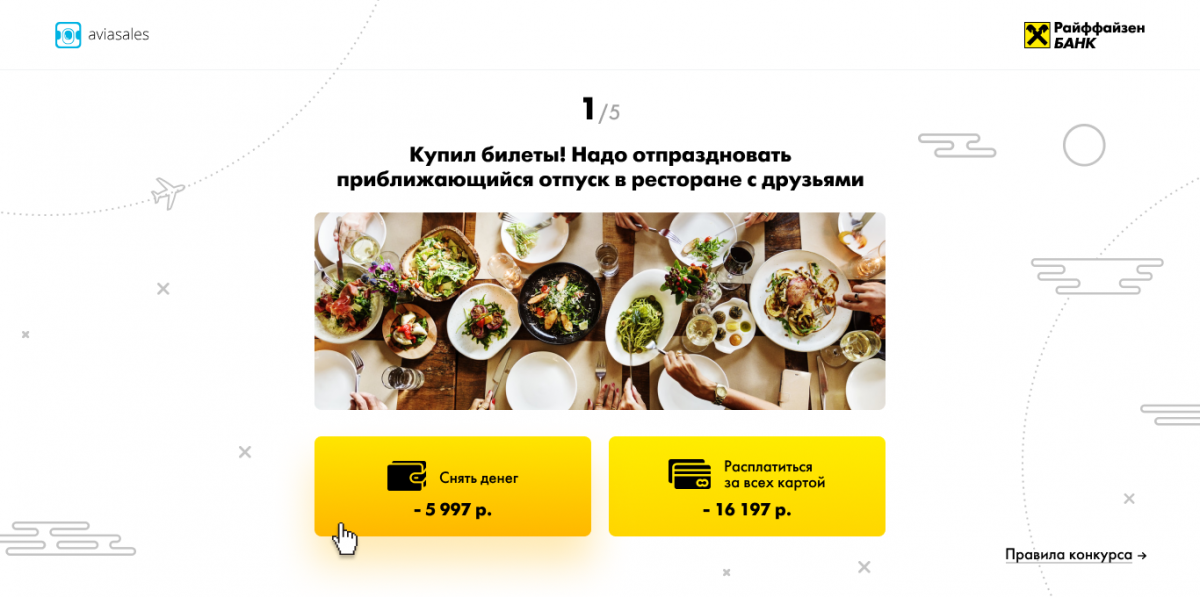В каждой мини-игре по 7 заданий на планирование отпуска с двумя вариантами ответов. На старте пользователю предлагают виртуальную карту с балансом 100 000 рублей и 2 800 миль. После ответа на каждый вопрос баланс меняется. В результатах посетителю показывают потраченные деньги и заработанные мили. Так аудиторию знакомят с механикой работы карты «Райффайзен Банка».