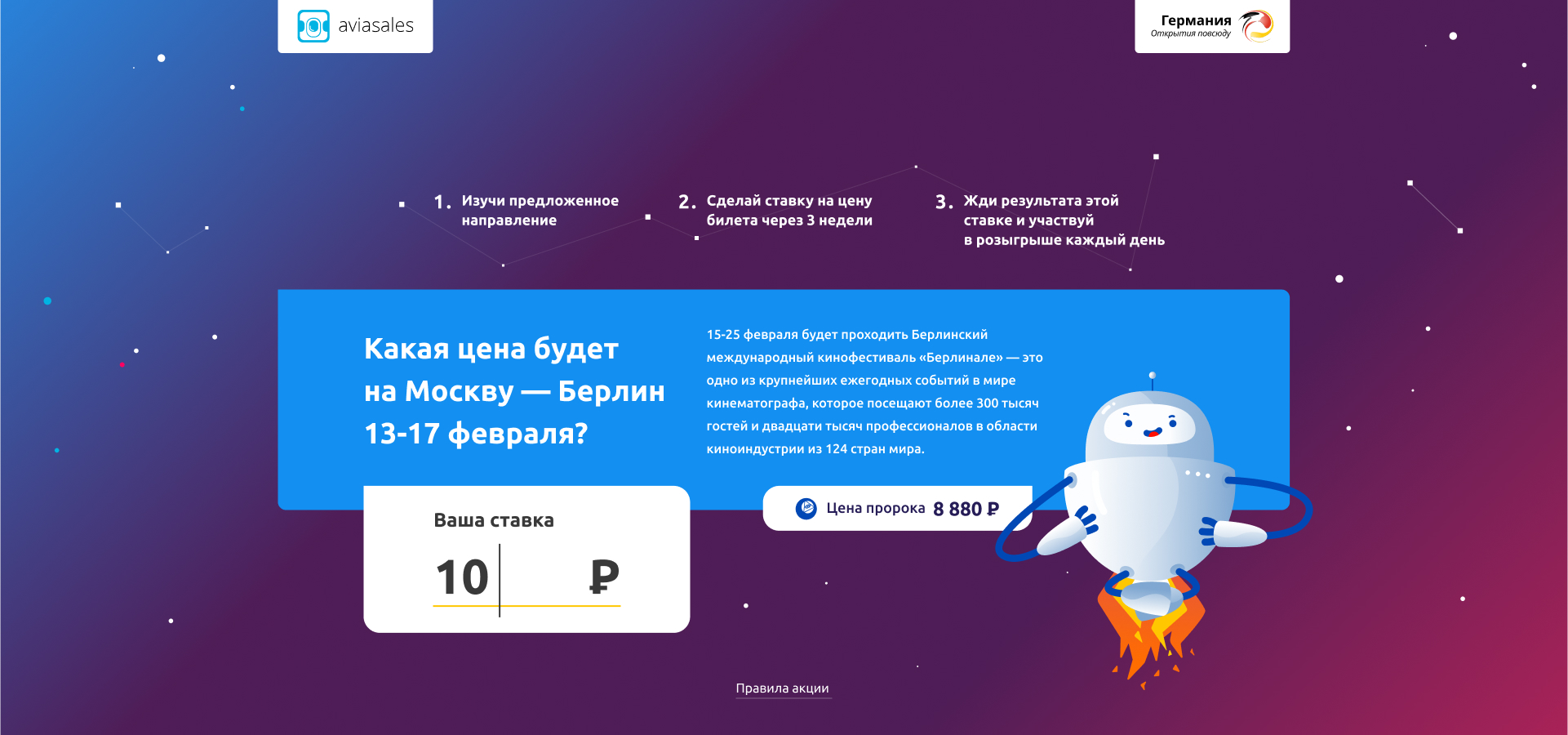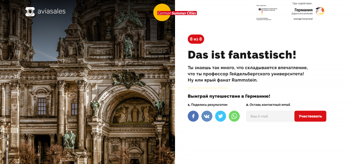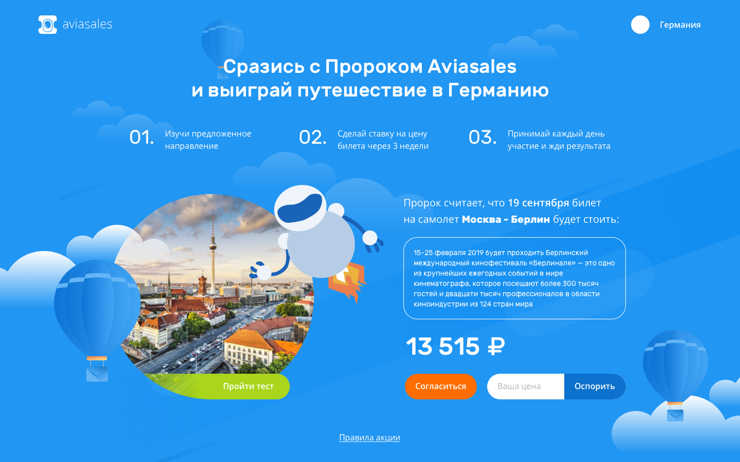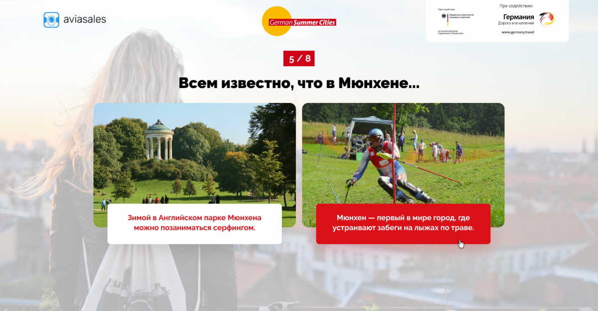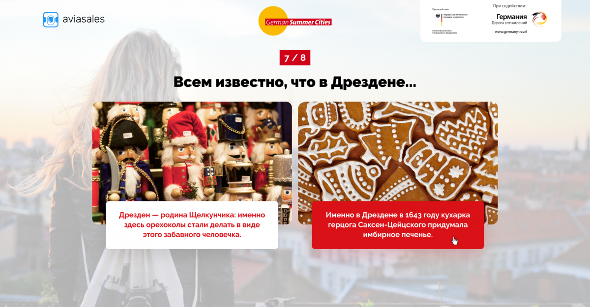 Пользователю предлагают сразиться с Пророком Aviasales и выиграть путешествие в Германию. Каждый день — новый город, новая дата полёта и рассказ, что в эти дни происходит в выбранном месте.