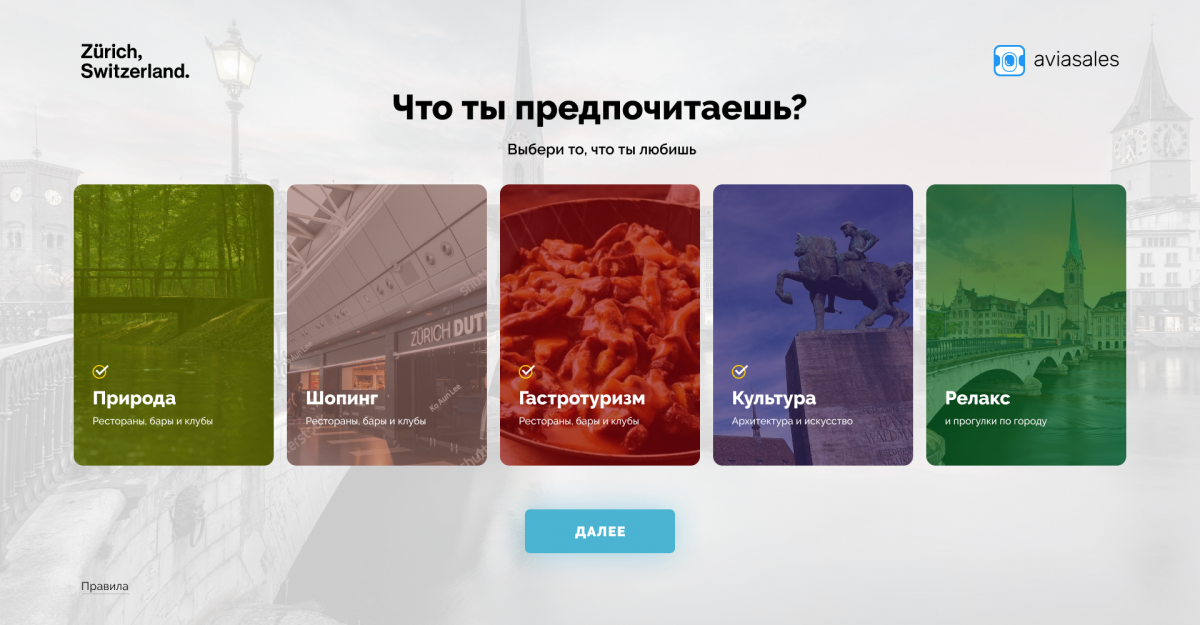В качестве результата человек видит количество правильных ответов и идеи, на какие интересные мероприятия можно полететь в каждый из городов этим летом.
