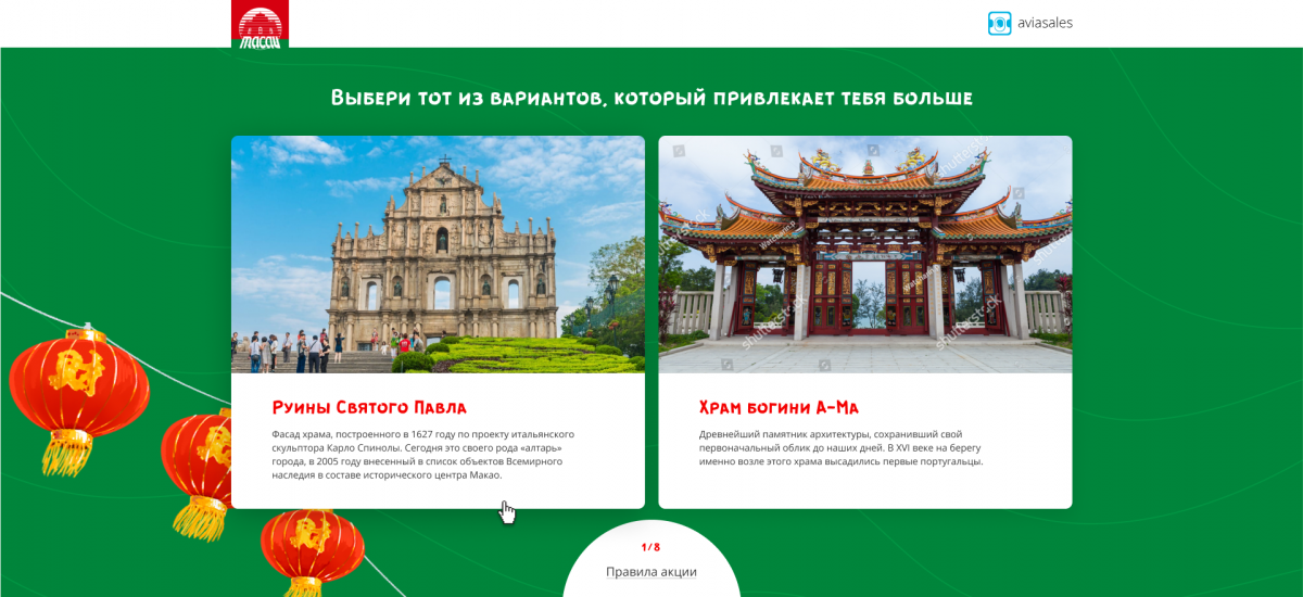 На лендинге пользователю предлагают ответить не несколько вопросов о его привычках и предпочтениях. С помощью теста человек узнаёт яркие противоположности своего характера, получает рекомендации, какие места и достопримечательности Макао посетить, а также присоединяется к розыгрышу путешествия в этот город.