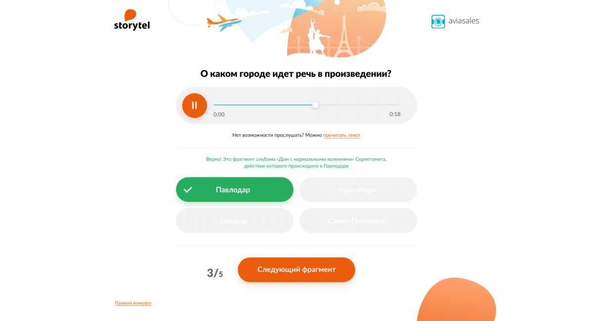 Квиз, в котором пользователи угадывают города по отрывкам из аудиокниг.