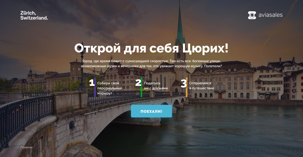 Спецпроект, в котором пользователи узнают факты о Цюрихе и составляют персональный маршрут для путешествия туда.
