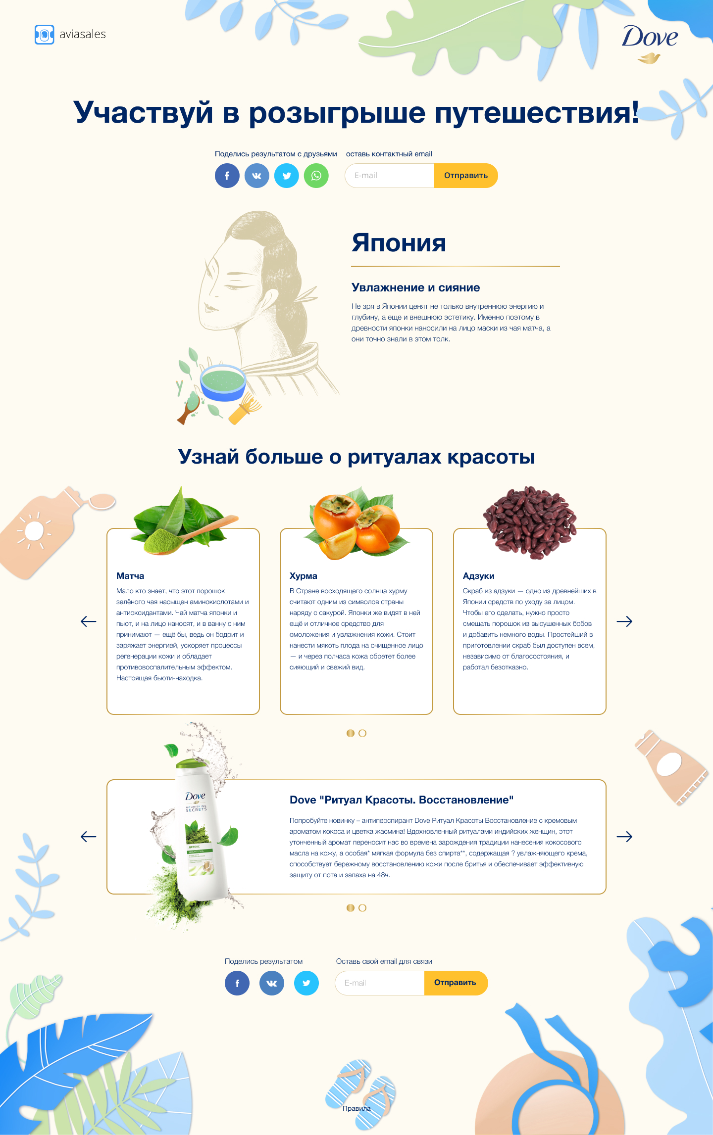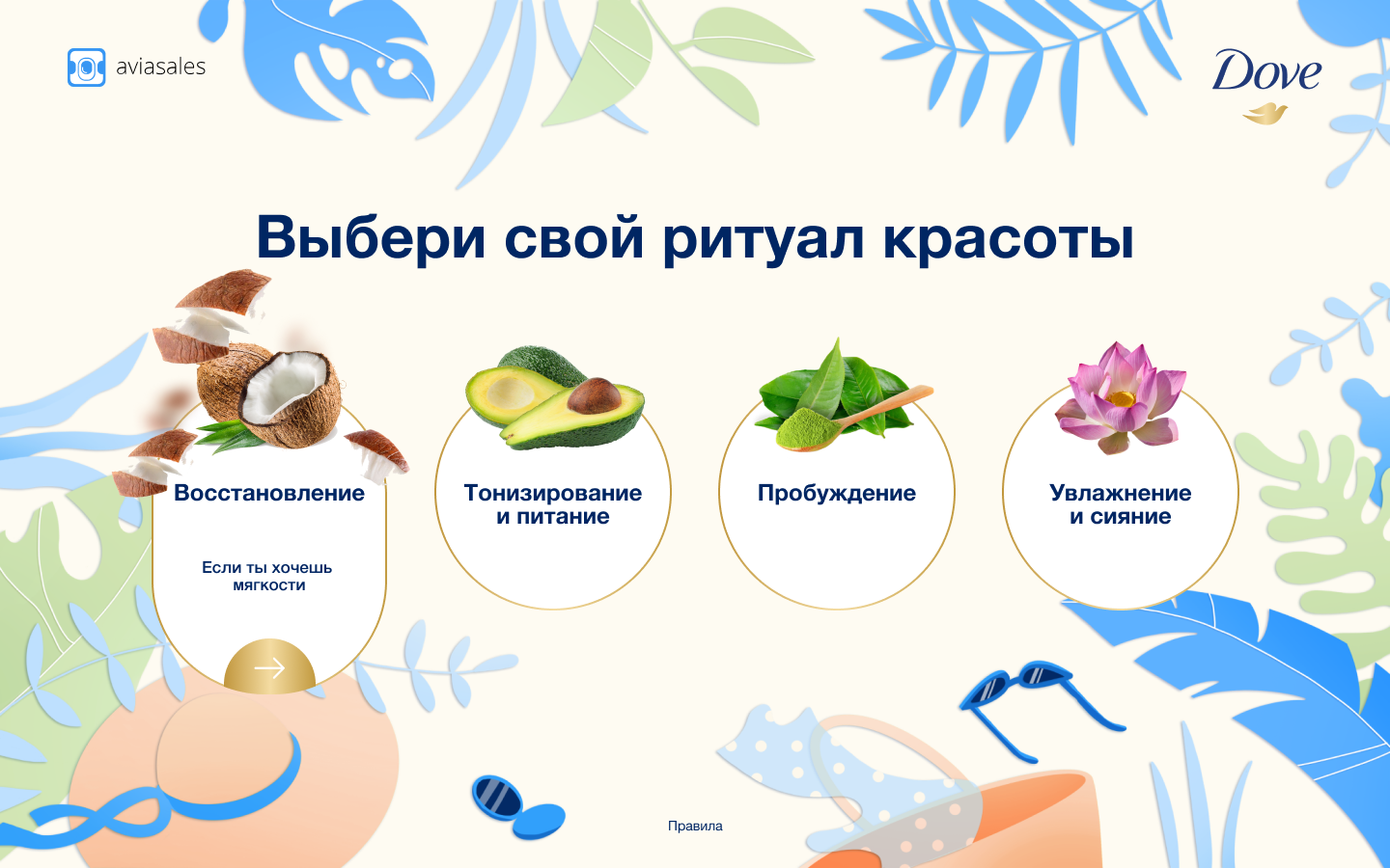 Каждый раздел отсылает к одному из ароматов линейки Dove «Ритуалы красоты».