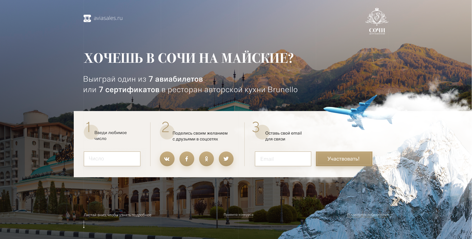 Пользователям предлагают указать любимое число в поле, поделиться информацией о розыгрыше в соцсетях и оставить свой email для связи, чтобы поучаствовать в конкурсе.