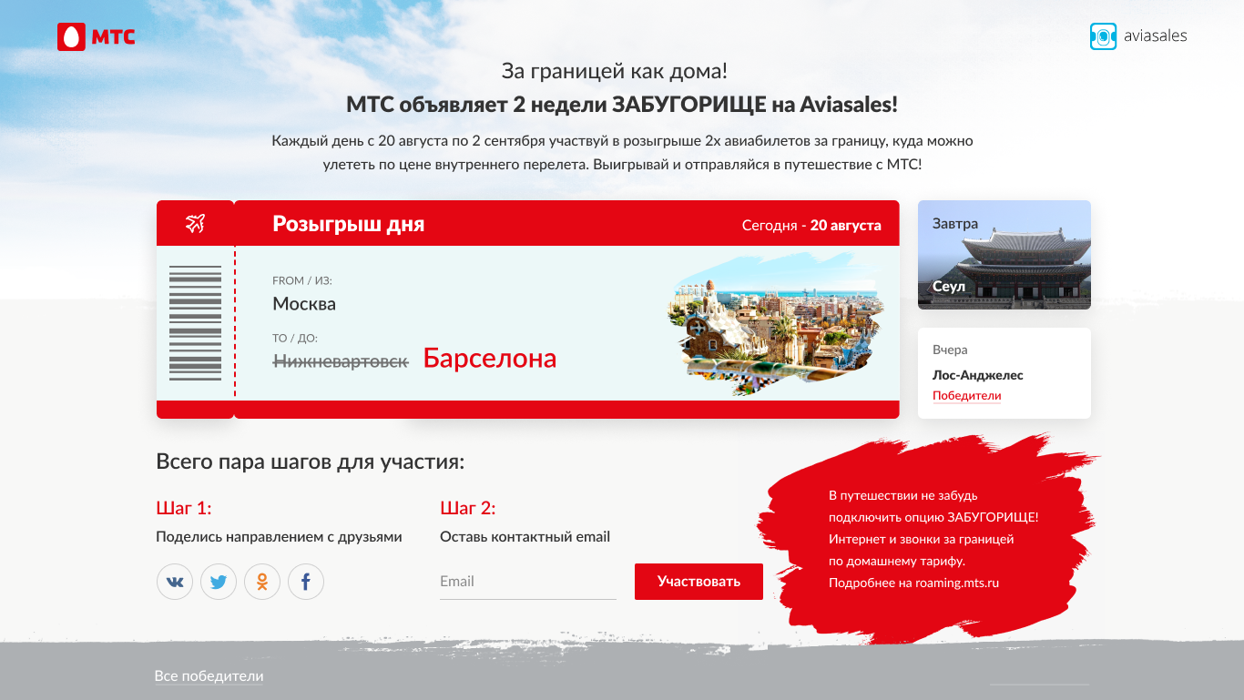 «Забугорище» — совместный спецпроект «Авиасейлс» и МТС. Неделю пользователи с помощью промо-лендинга узнавали, в какие города мира можно купить билеты по стоимости внутрироссийских перелетов. Каждый день проходил розыгрыш этих самих билетов — 2 штуки в день.