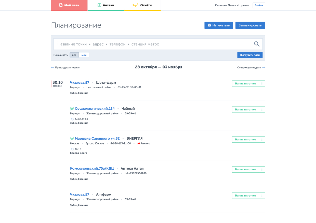 На этапе аналитики было проведено несколько интервью с руководством компании и представителями, чтобы выяснить, какие функции должны быть реализованы в сервисе. Из каких действий складывается рабочий день представителя. Какой горизонт планирования и предоставления отчетности необходимо выбрать, чтобы инструментом реально было удобно пользоваться.