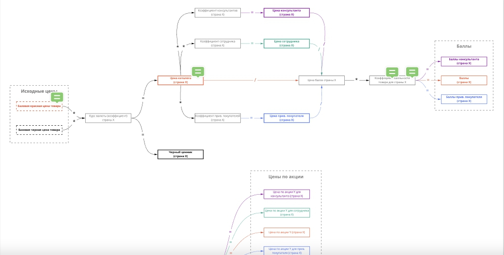 Учесть, например, отдельно цены на косметологические услуги, цены на сайте, цены, по которым консультанты продают и покупают товары. Мы объединили большой набор цен в отдельном сервисе, который общается с другими системами и автоматически отсылает нужную информацию в них.
