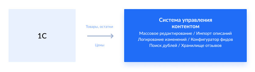 Сначала «1С» интегрируется в PIM-систему, откуда она берёт все данные: номенклатуру товаров, информацию об остатках на складах и цены. «1С» отправляет данные в едином формате.