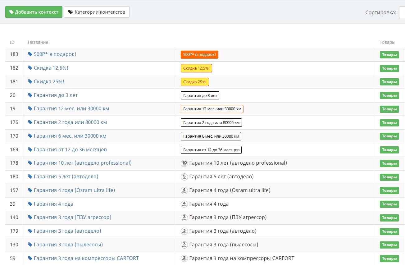 Пример сортировки товаров в СУК: