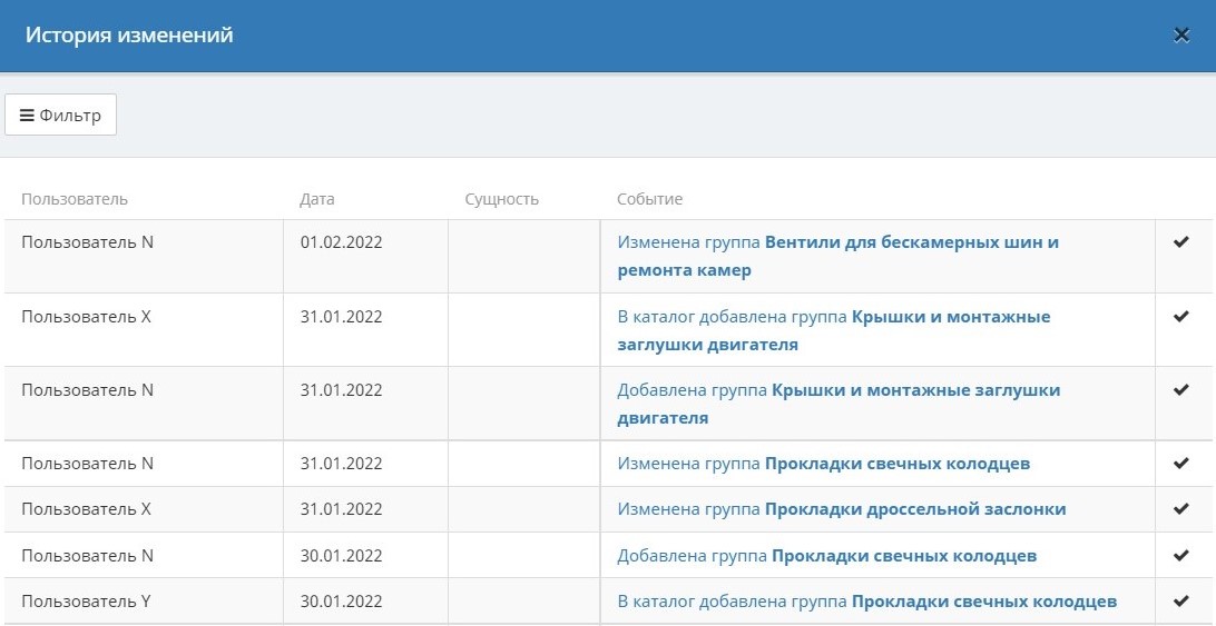 Еще пример. Есть категорийный менеджер, который отвечает за шины и придаёт структуру этой категории: как она выглядит и какие данные содержит. А есть контент-менеджер, который наполняет товары описаниями, фотографиями и добавляет свойства, которых не хватает в 1С. Все внесенные изменения контент-менеджером отображаются не сразу, они логируются, а затем категорийный менеджер этой категории и модератор в одном лице, проверяет их. Принимает изменения через галочки «принять» или «отклонить». Все принятые изменения выгружаются на сайт в каталог.