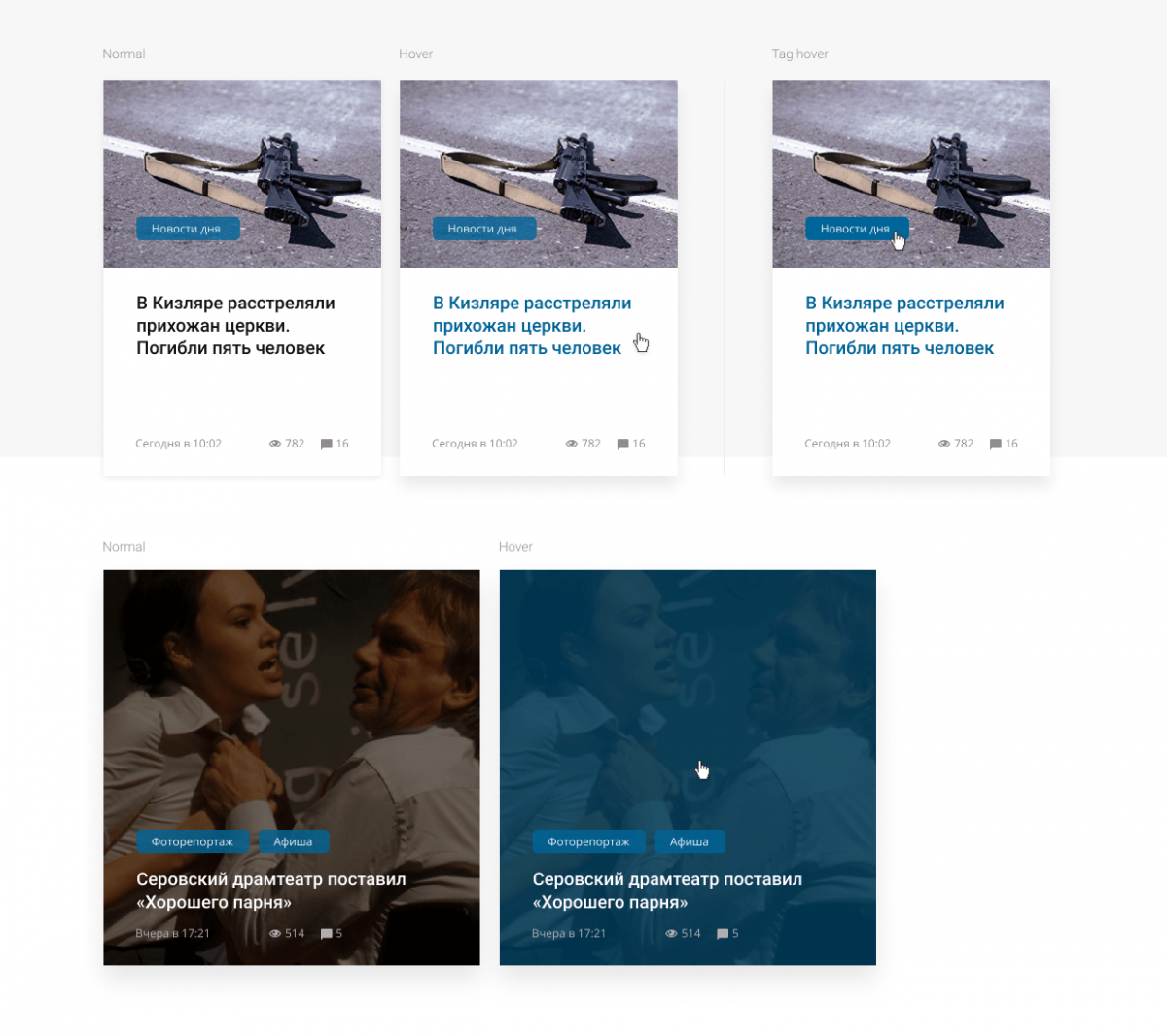 Мы вникли в бизнес-процессы клиента и проанализировали, как потребляют контент пользователи. Взяли за основу UX, с которым мы сталкиваемся каждый день в соцсетях и на новостных сайтах, — то есть потоковый контент. И пошли по этому пути, разделив по категориям: криминал, коммунальные услуги, сугробы с надписью «Навальный».