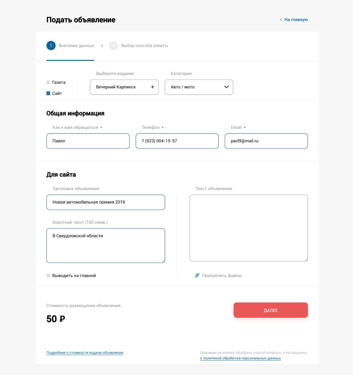 Теперь каждый может подать объявление на сайт, заполнив удобную интерактивную форму, а также сразу купить публикацию в печатном издании.