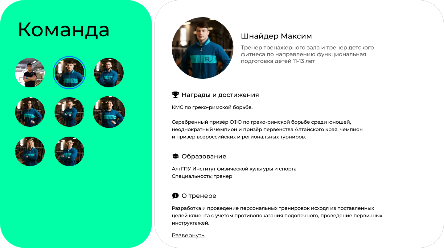 Позволяет гостям получать полную информацию о каждом тренере клуба. В виджет можно добавлять новых тренеров, менять их местами.