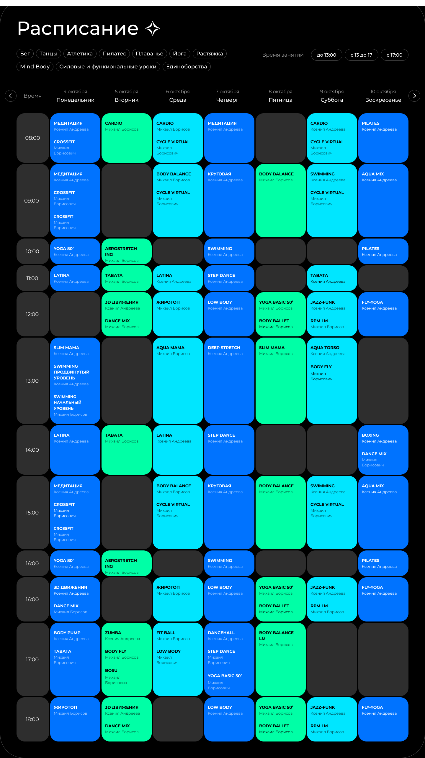 Расписание может меняться, а актуальную информацию об изменениях часто негде посмотреть, только если вам не сообщат об этом лично. Например, тренер заболел и отменил занятия по йоге в среду, сообщив об этом руководителю. Расписание у River всегда будет актуальным, потому что оно подтягивается напрямую из внутренней CRM-системы River ClubIS. Так что когда руководитель занесет в CRM данные о том, что занятие отменено – это будет отображено и на сайте.