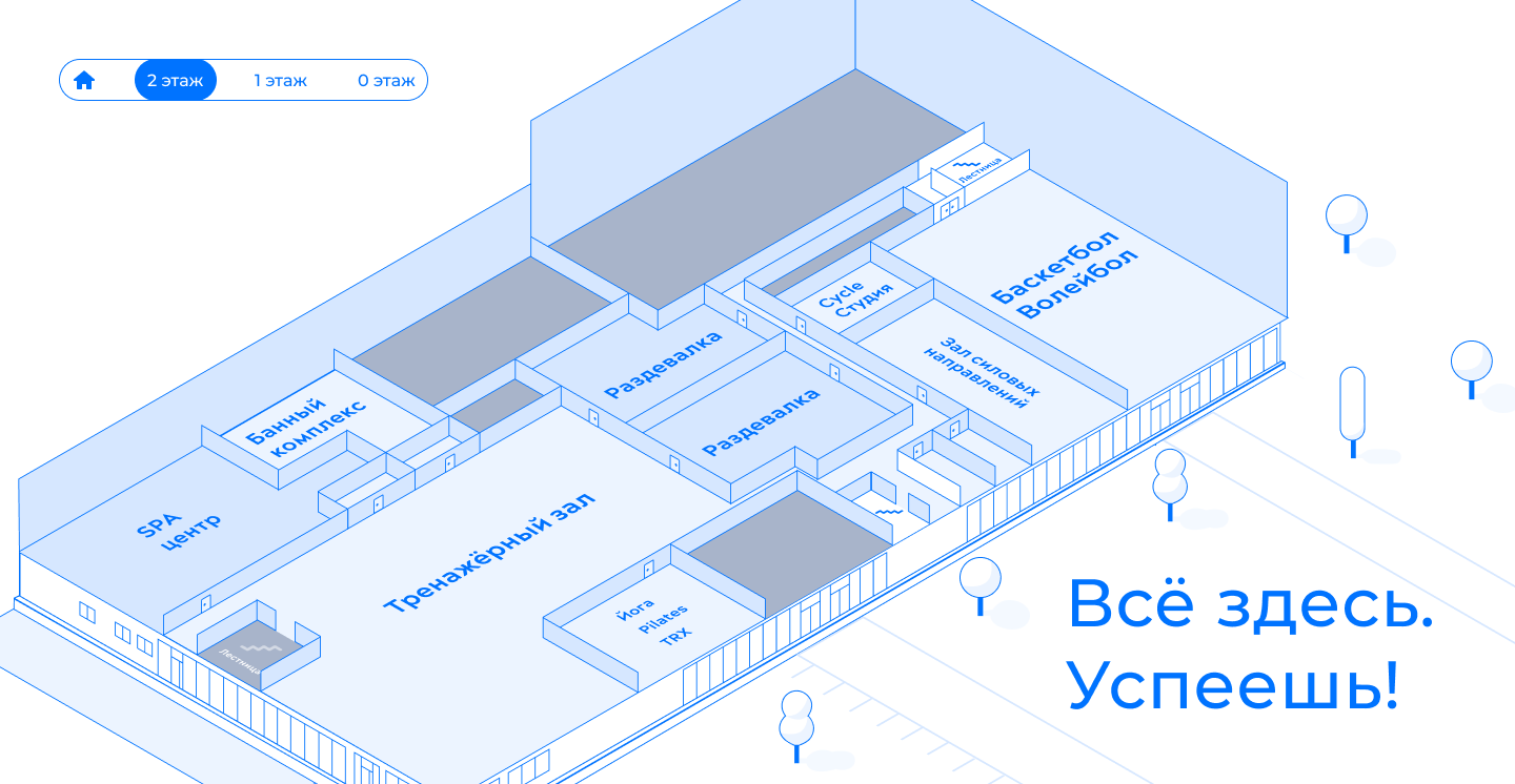 Для того, чтобы гости клуба могли легко ориентироваться в большом комплексе, мы разработали карту клуба, на которой можно заранее посмотреть, где что находится и куда нужно идти.