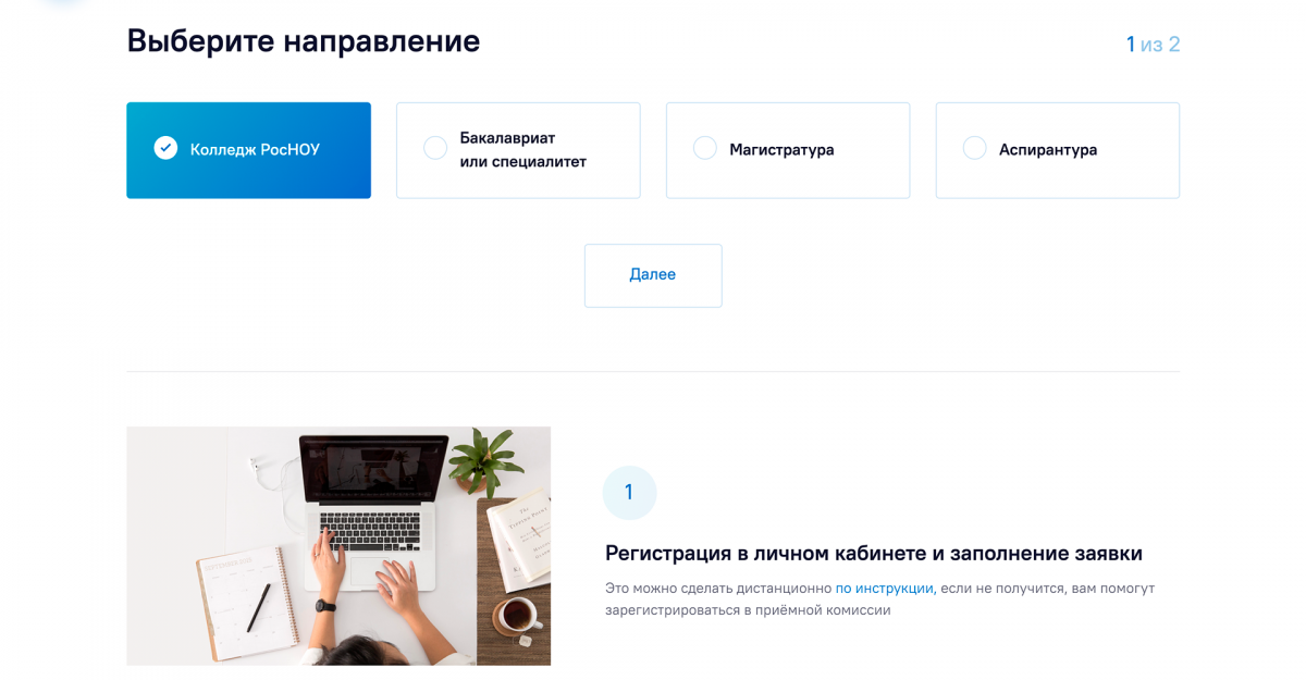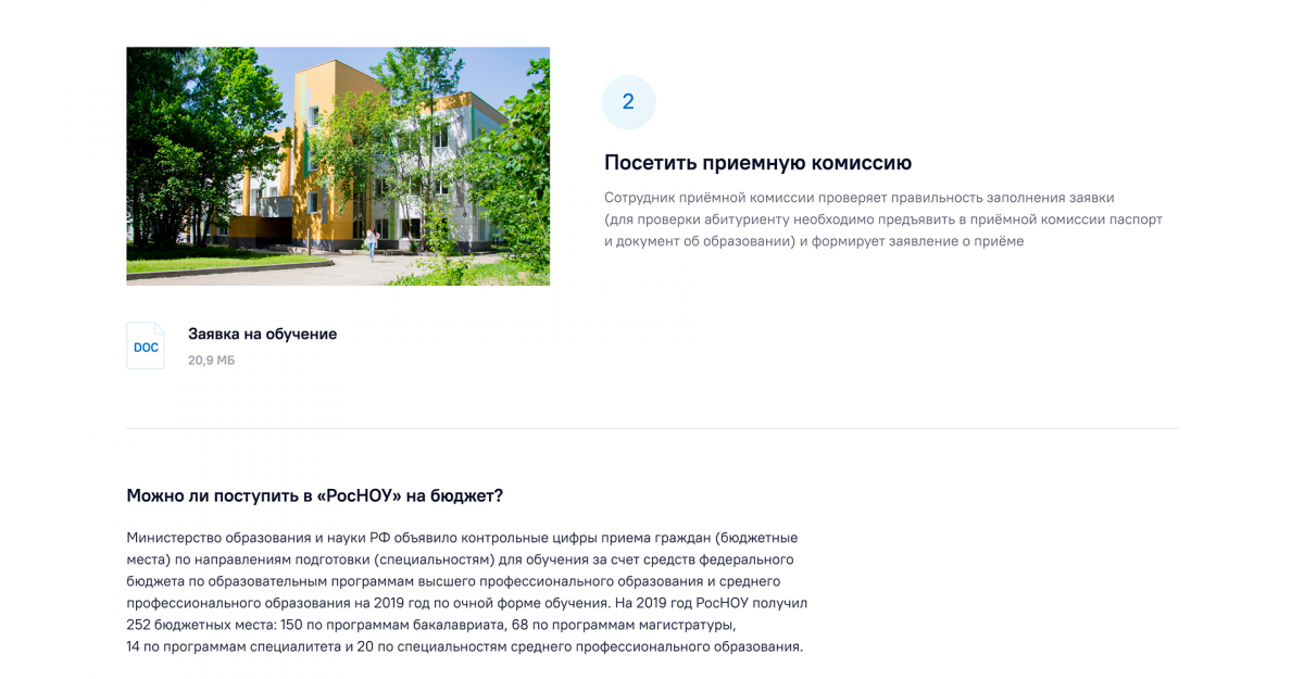 Сначала человек выбирает направление и сразу видит пронумерованные шаги поступления, то есть получает алгоритм действий. Затем он узнаёт перечень всех необходимых документов. А заканчивается страница формой обратной связи, чтобы все вопросы пользователя оказались решёнными наверняка.