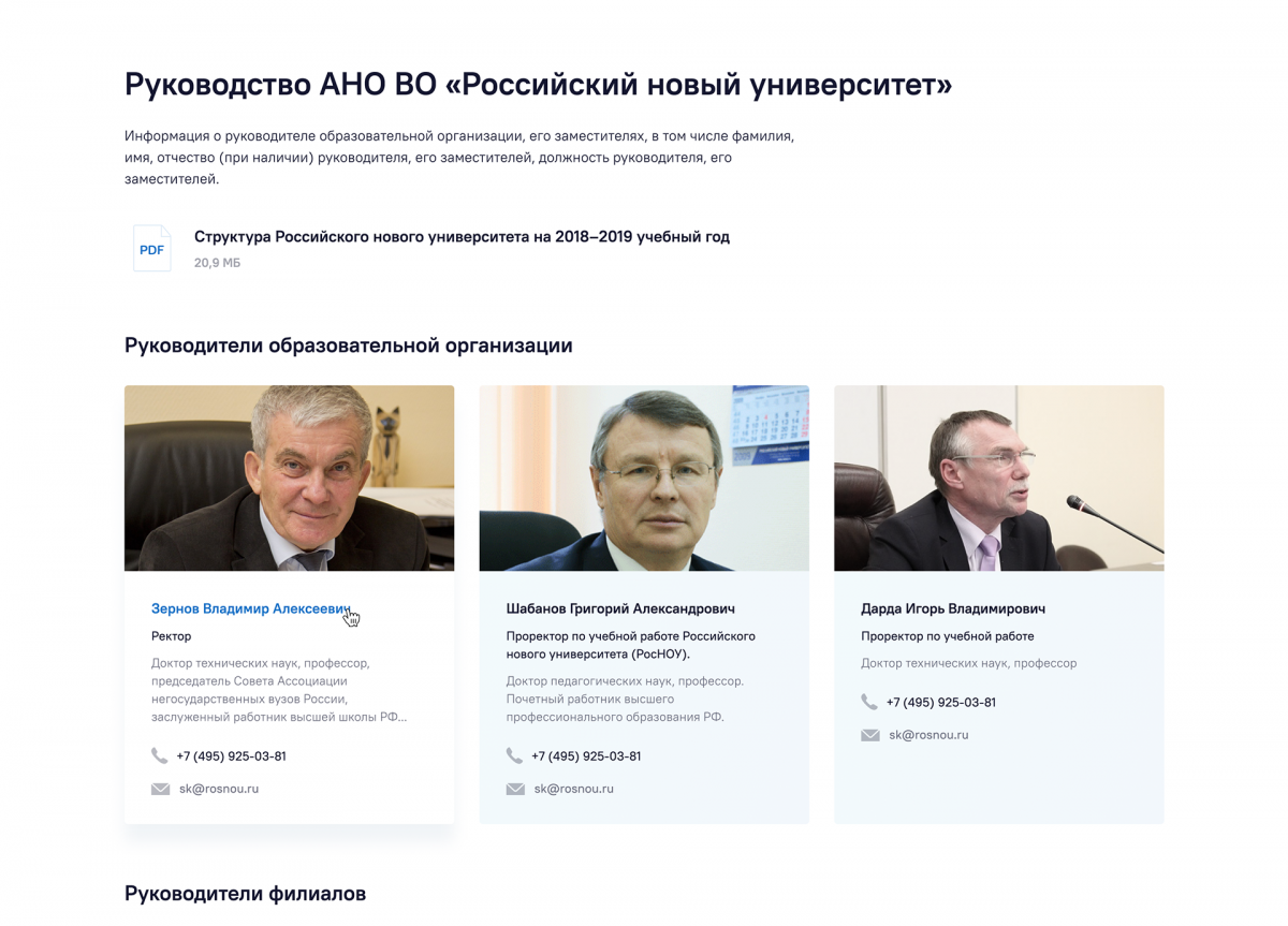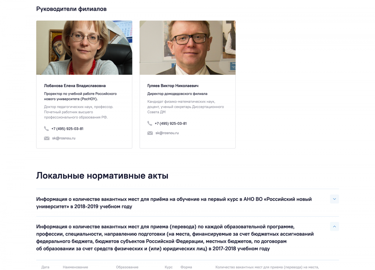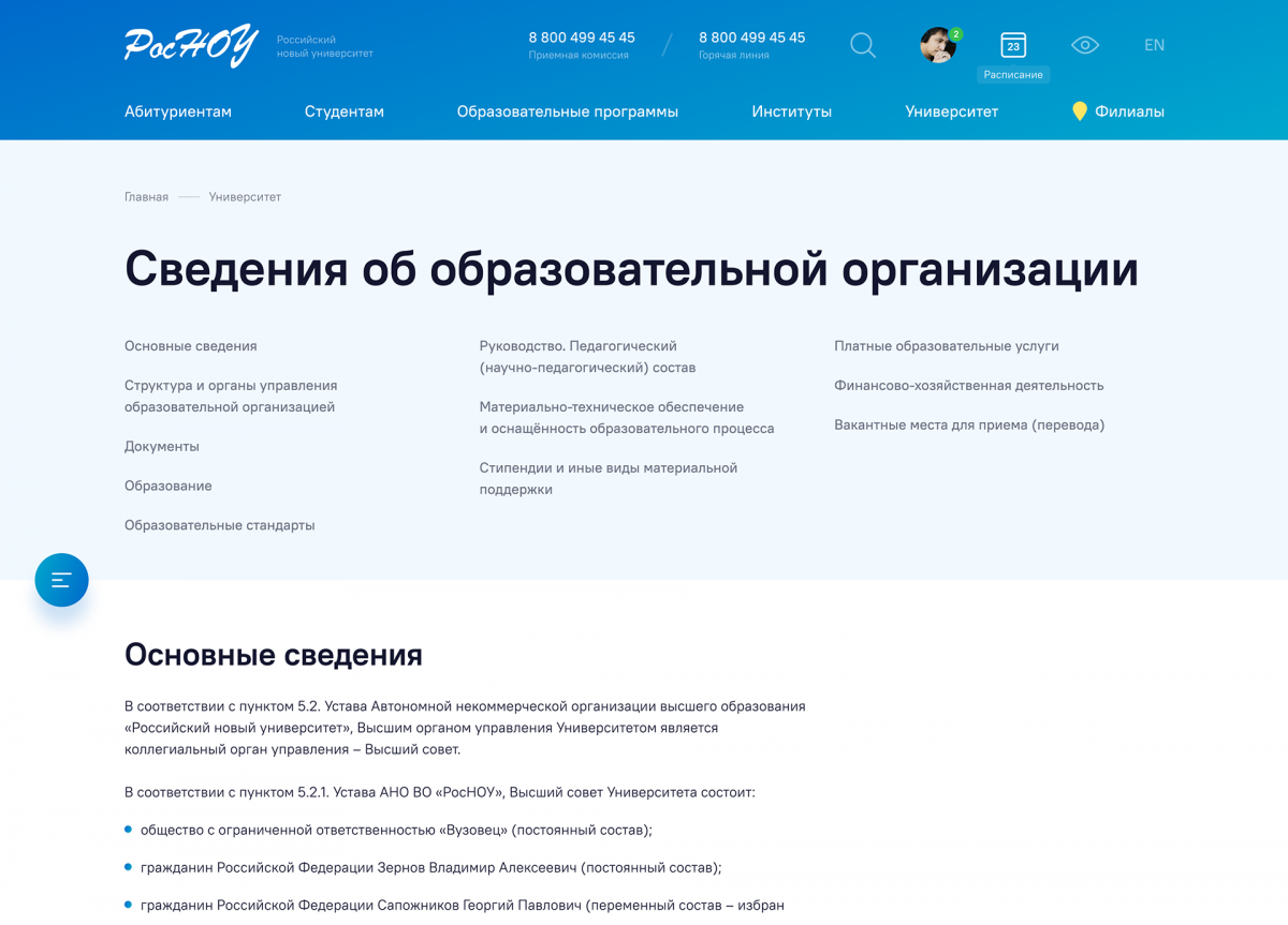 Например, Приказ Рособрнадзора № 785 от 29.05.2014 требует наличие специального раздела «Сведения об образовательной организации», в котором должна быть определённая структура с общим механизмом навигации.