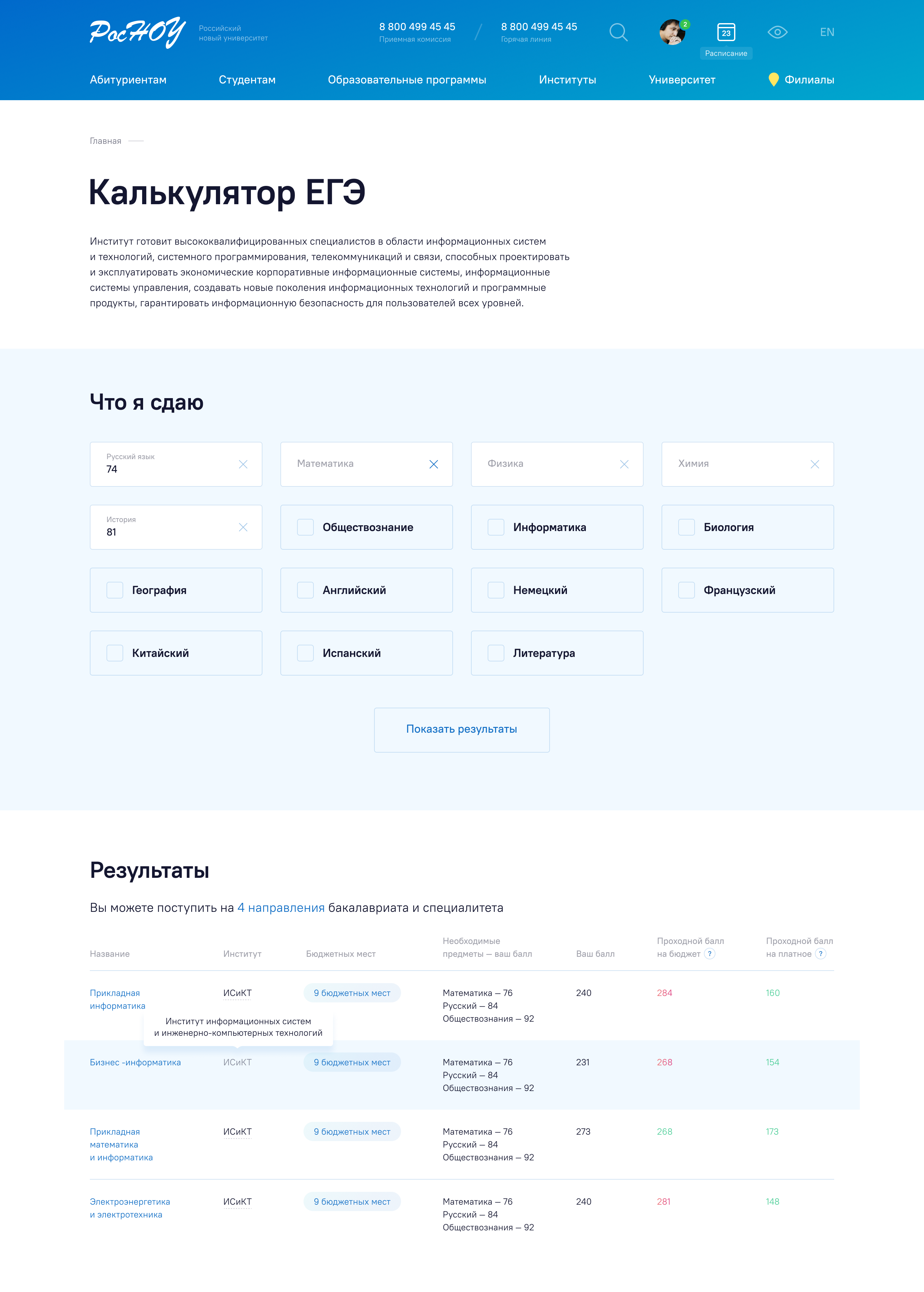 Каждый абитуриент хочет как можно быстрее узнать о том, куда он может пройти со своими результатами ЕГЭ. Мы предусмотрели такую возможность, и теперь на сайте есть удобный инструмент для поиска направлений.