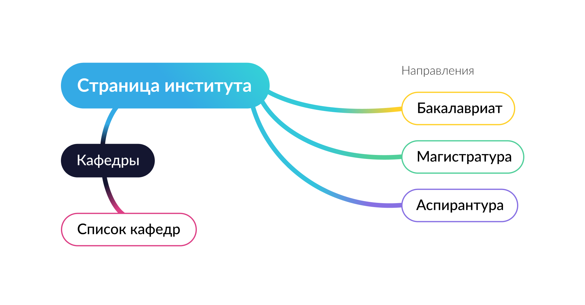 Перед нами стояла задача: сделать ёмкие, но при этом простые страницы для каждого института. Основная сложность была в запутанной структуре и большом количестве взаимосвязей между элементами. Кроме этого, подача информации различается для каждого типа пользователей.