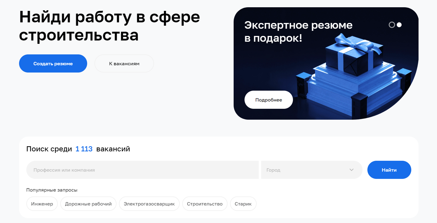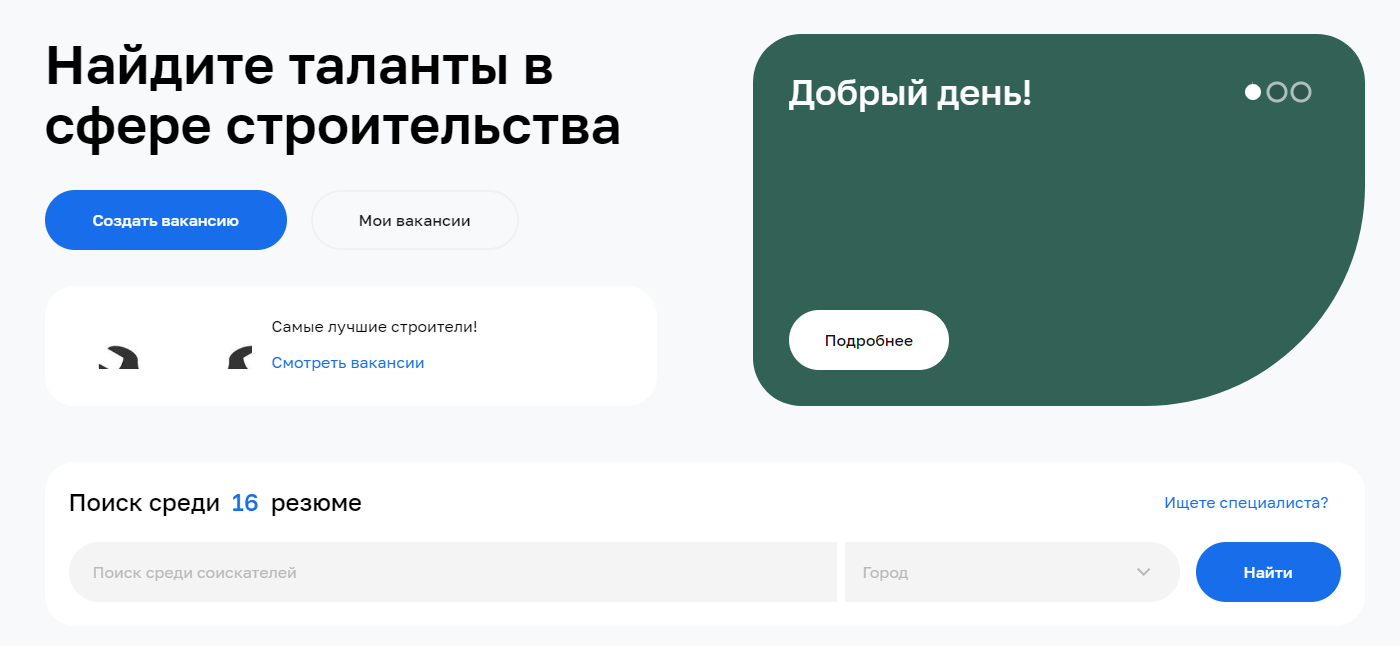 Все функции платформы адаптированы под специфику строительного рынка. В резюме, вакансиях, поиске и фильтрах по ним пользователи указывают: