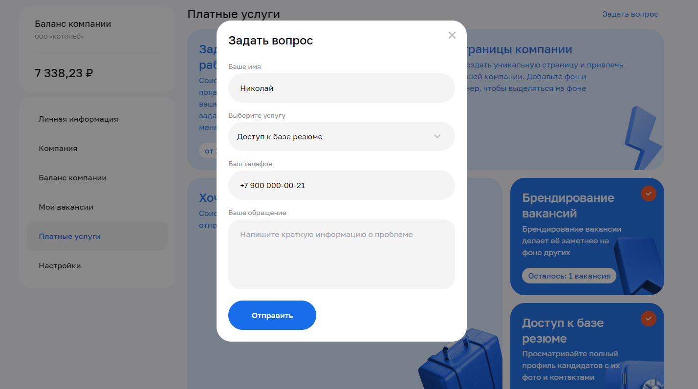 Задать вопрос работодателю — соискатели, у которых появились вопросы по вакансии, смогут задать его напрямую менеджеру компании.