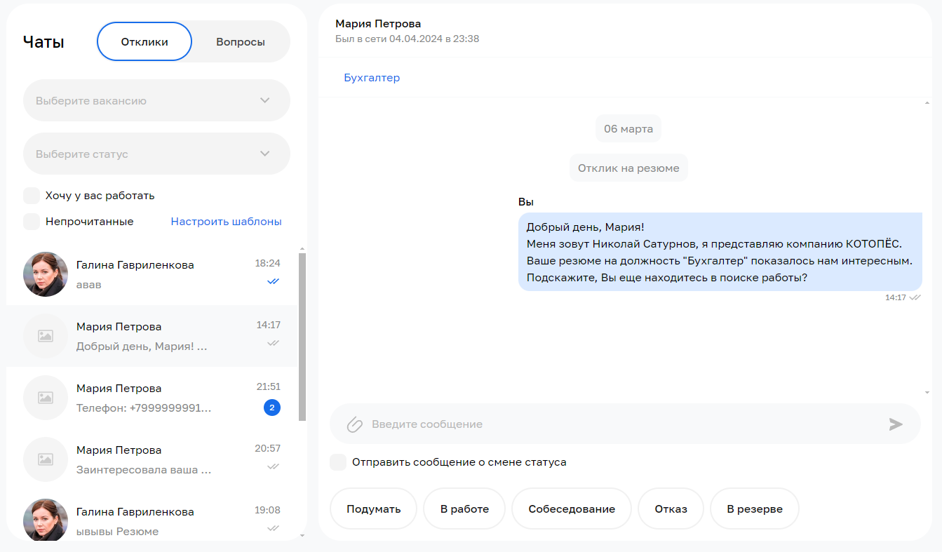 Переписки можно фильтровать по вакансии или статусу соискателя: