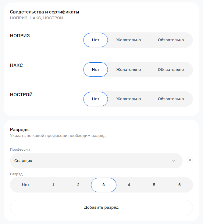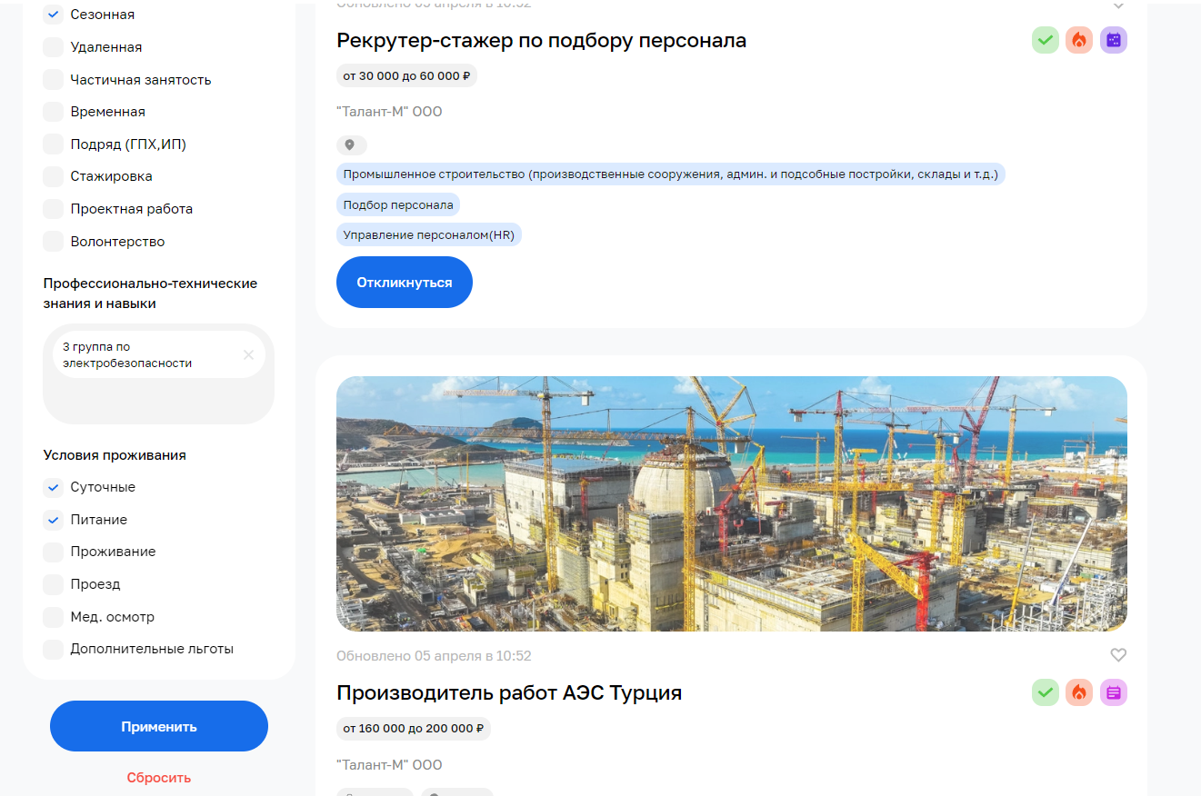 В нём, помимо классических параметров вроде зарплаты, графика и опыта работы, можно настроить специализированные фильтры для строительной сферы: