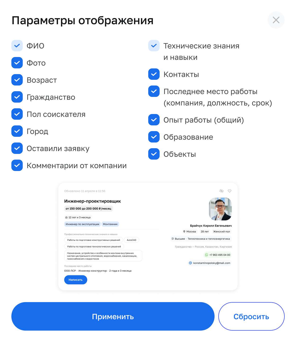 Компания может настраивать в общей выдаче параметры отображения, чтобы не отвлекаться на ненужные пункты во время поиска людей в команду.