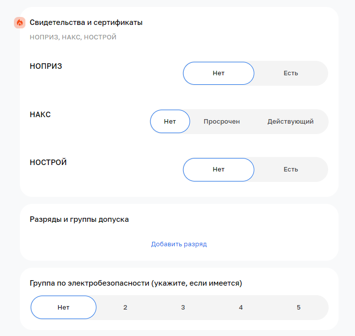 Также в блоке соискатель отмечает свои разряды, группы допуска по электробезопасности и прикрепляет портфолио.