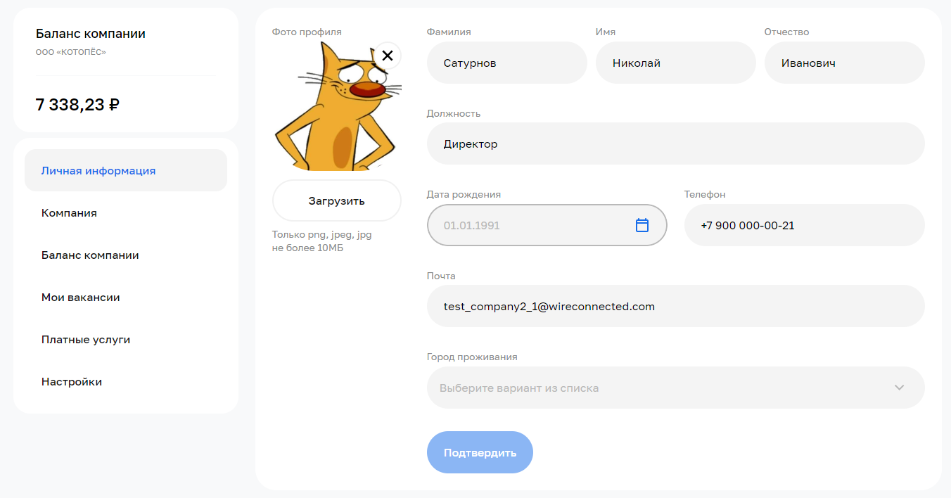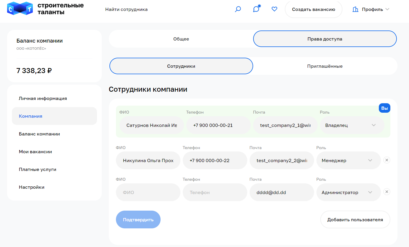 Профиль компании могут редактировать разные сотрудники: администраторы, HR-менеджеры и владелец компании. Группы пользователей и их уровень доступа к функциональности настраивают в личном кабинете.