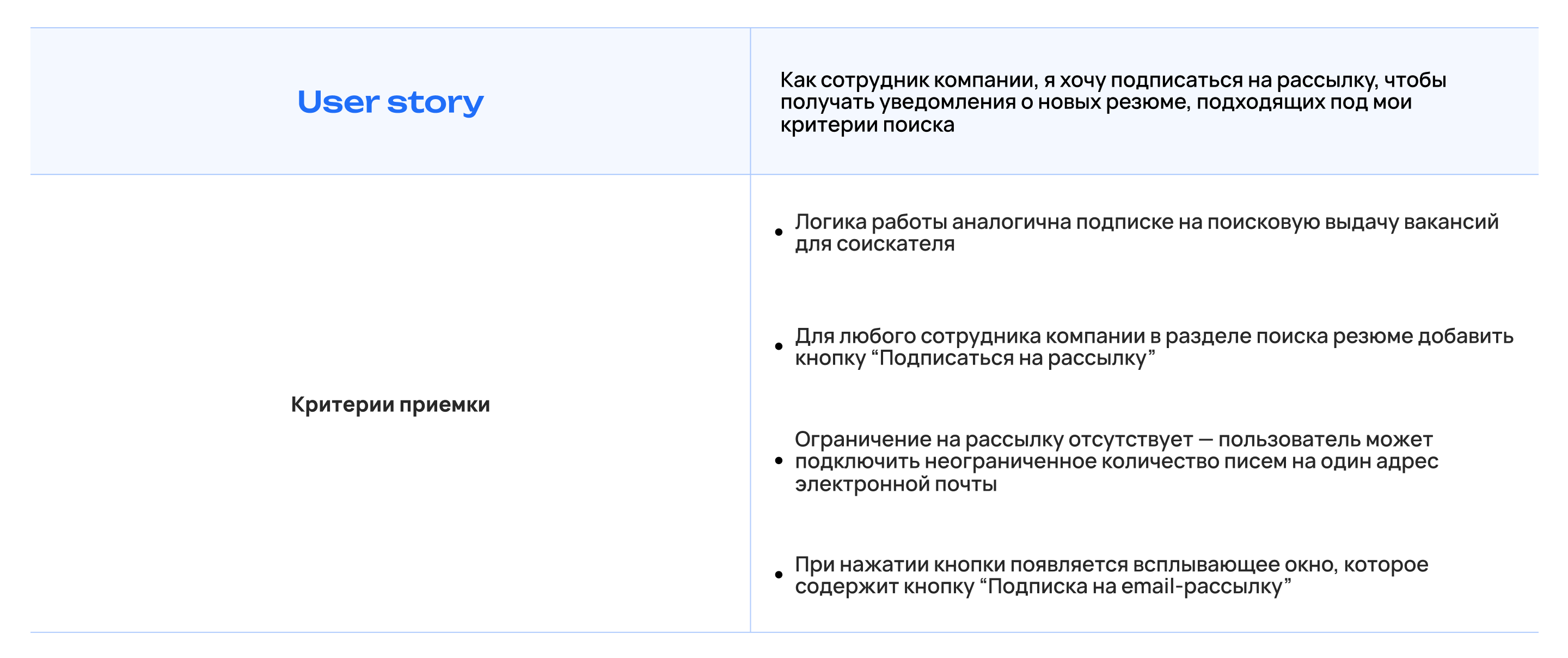 Прописали пользовательские истории. Они помогают увидеть функции продукта глазами конечного потребителя, разложить их на понятные элементы и сформировать структуру продукта. Команде разработки и лицам, принимающим решения, проще ориентироваться на достижение пользователем цели.
