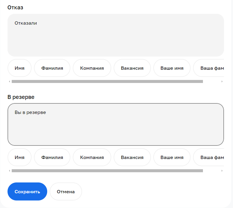 Сотрудникам компаний доступна настройка автоматизированных ответов с помощью шаблонов для каждого статуса, который они присваивают соискателю.
