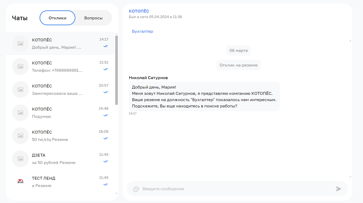 Сотрудники компании могут писать соискателям напрямую, если у них оплачен доступ к контактам. Также они получают отклики. Все сообщения отображаются в диалоговом окне, которое доступно через иконку чата на главной странице.