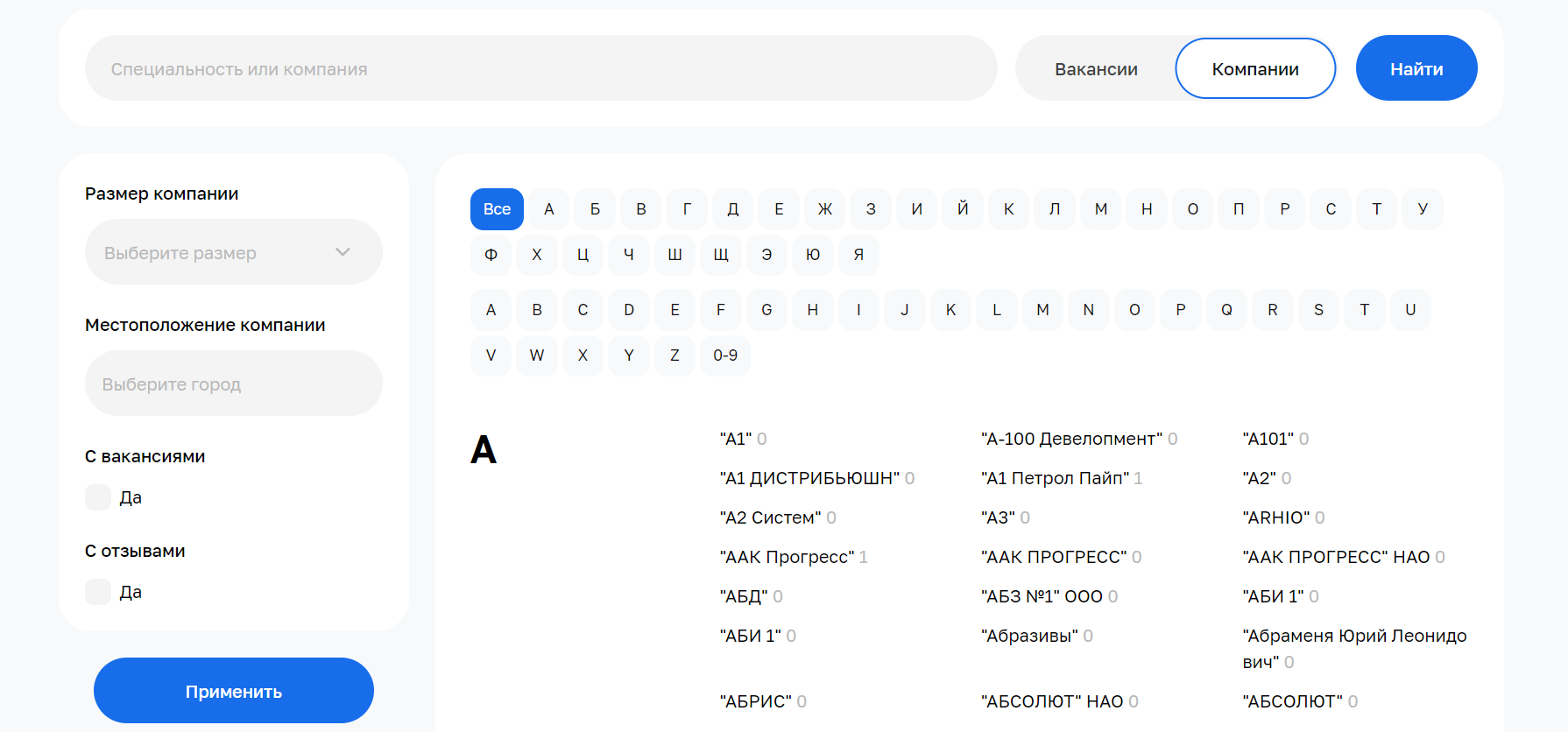 Соискателю доступен поиск вакансий по компаниям. Можно выбрать место работы по размеру и расположению предприятия или найти конкретную фирму из общего списка.