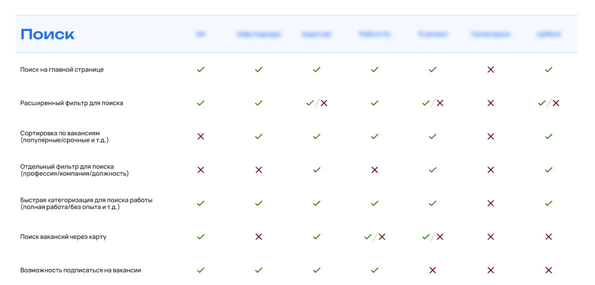 Провели конкурентный анализ, чтобы дополнить инсайты из интервью о необходимой функциональности. Выделили перечень сайтов-агрегаторов вакансий и изучили: