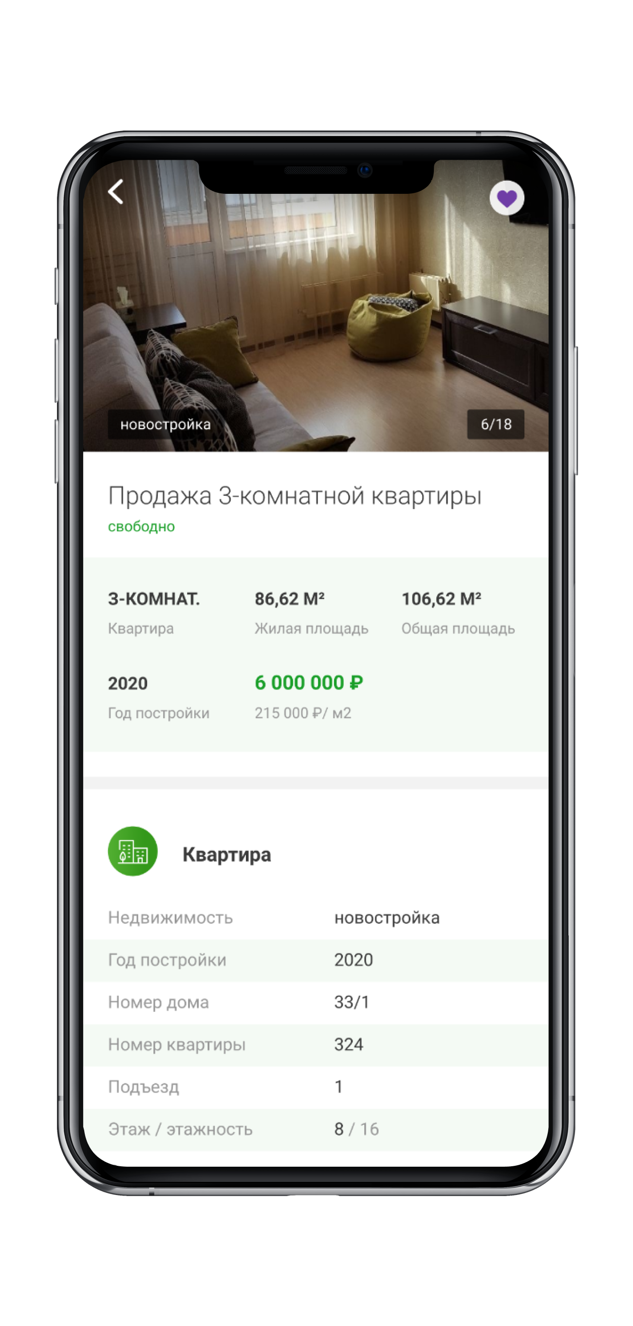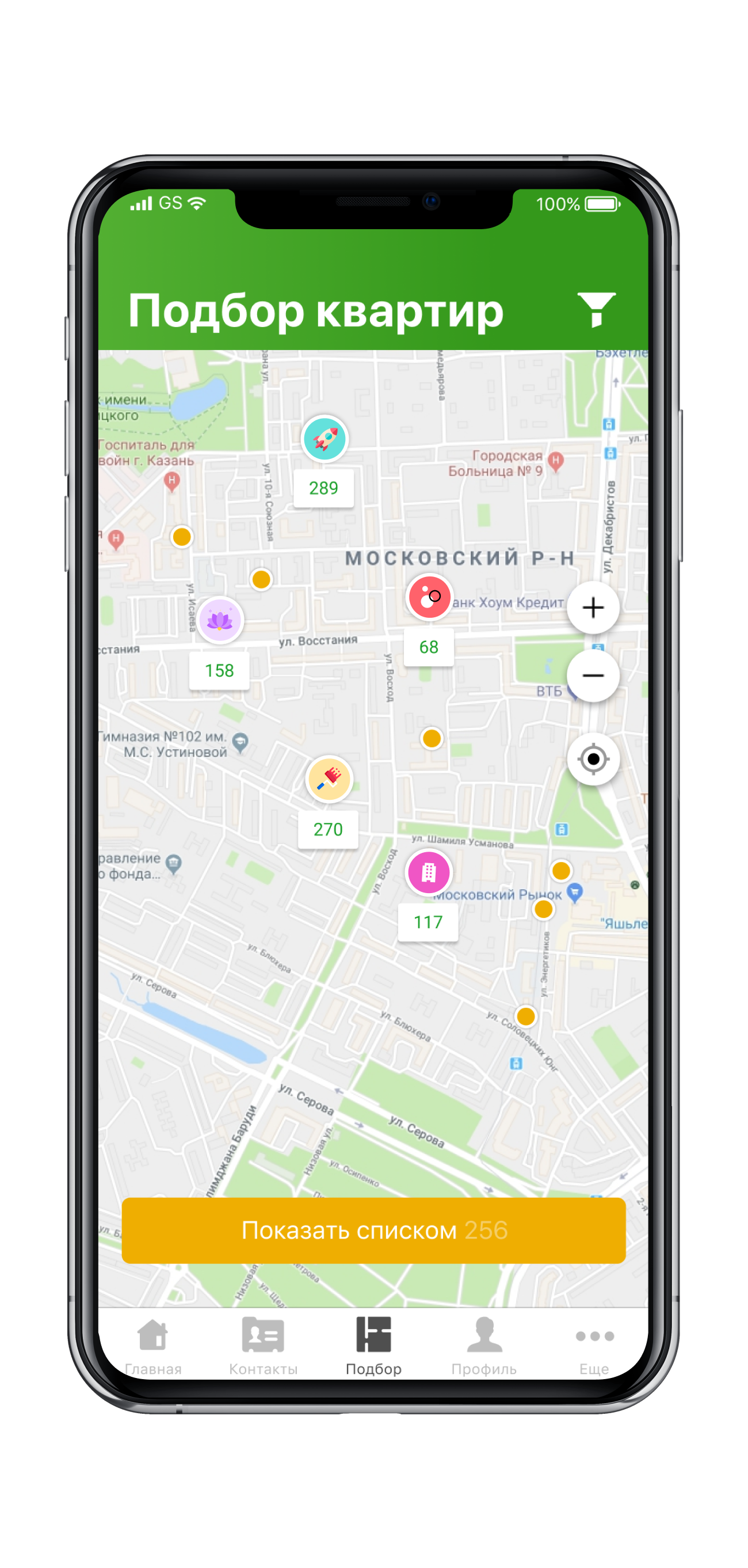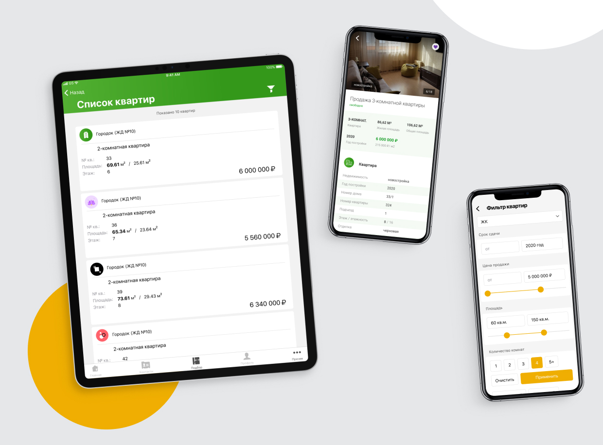 Покупка квартиры начинается с ее подбора. Поэтому важная часть приложения — это большой и удобный каталог недвижимости, который призван облегчить жизнь риелтору и его клиенту.