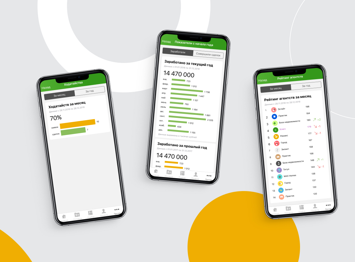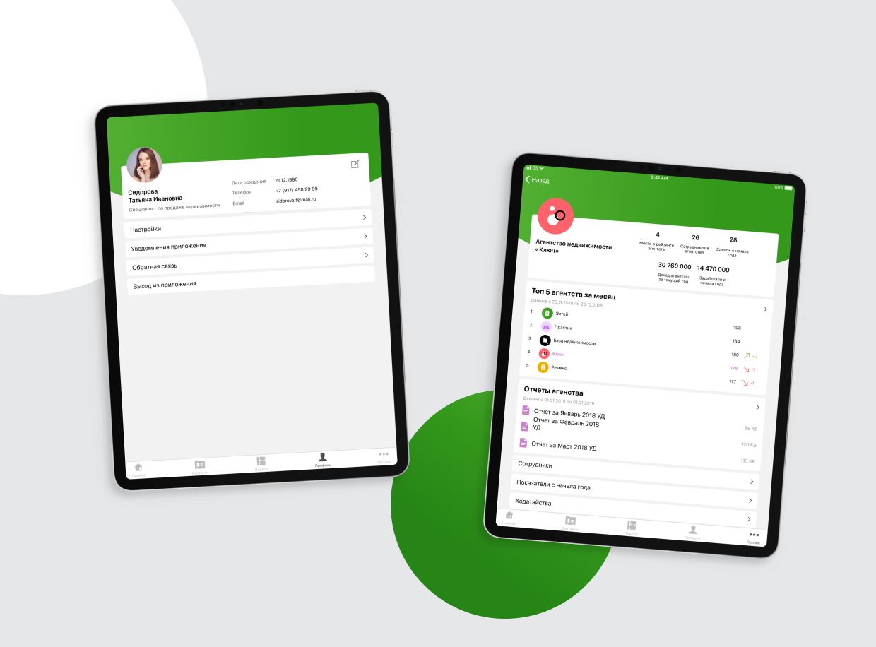 В приложении отображаются дашборды со статистикой агентства и каждого риелтора. Все очень прозрачно, отследить эффективность партнера не составляет труда.
